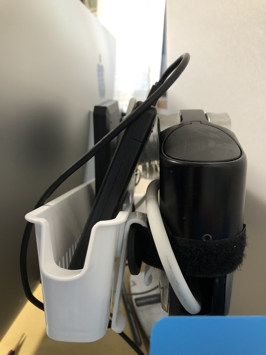 そうそう、ちょっと前に動画とかを編集するようにSSD(昔で言うとハードディスクみたいなもの)を追加で買ったので、Macを取り付けているモニターアームに吊り下げられる形に付けてみた。MacはモニターにUSBポートが付いているので、モニターアームをつけるとアームを動かすたびにUSBが引っ張られてしまうという形になってしまうのだ。今までは長いUSBケーブルで解決してたけど、これでどうだろうか?